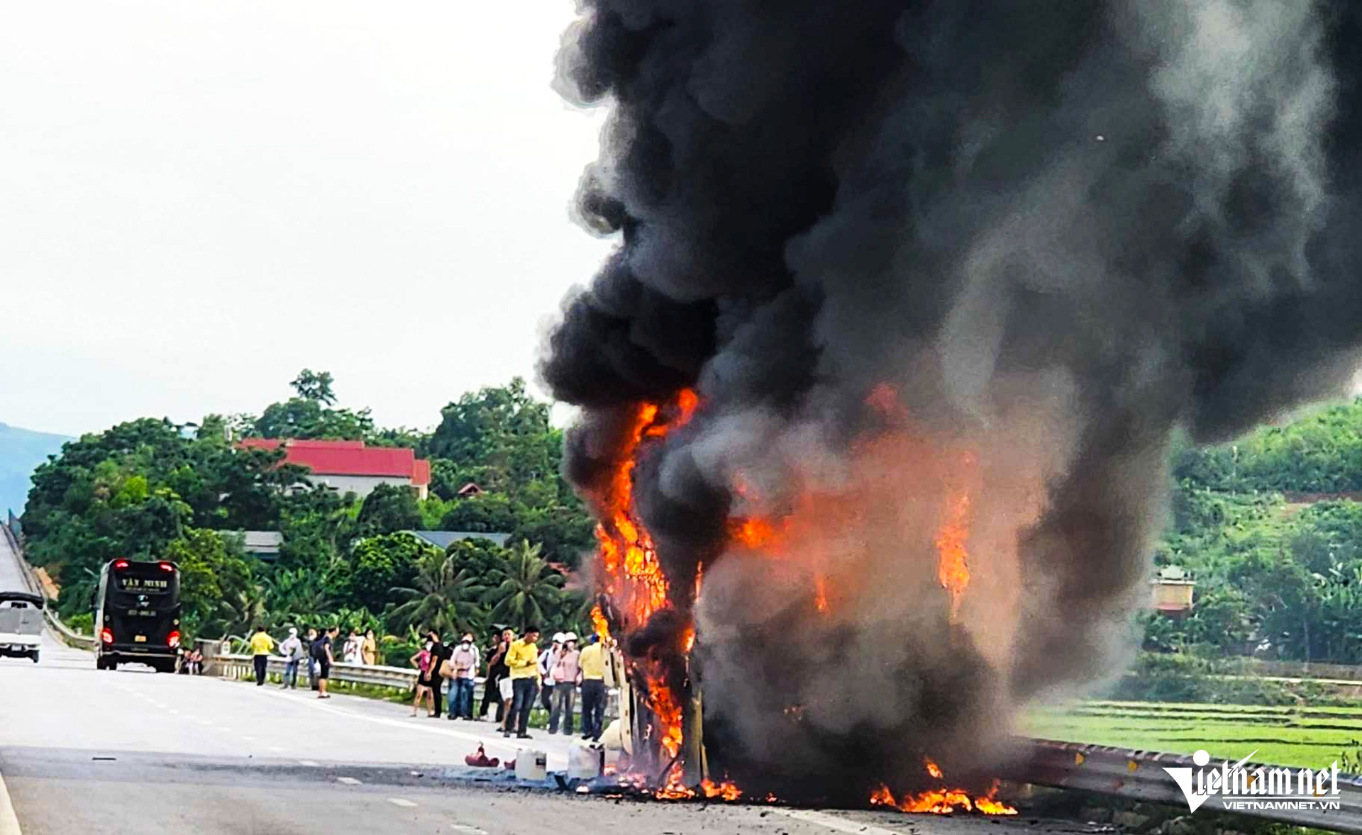 Ban đầu là khói đen sau đó ngọn lửa bùng lên bao trùm ô tô, tạo thành cột khói cao hàng chục mét, tài xế xe khách vội tấp vào làn khẩn cấp, hành khách trên xe cũng nháo nhào thoát khỏi phương tiện.