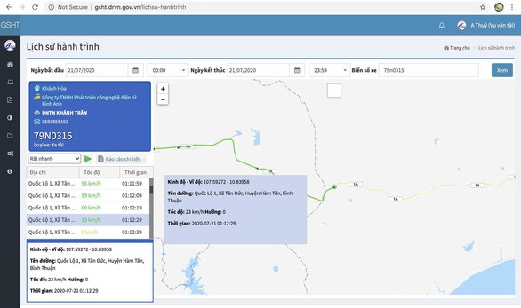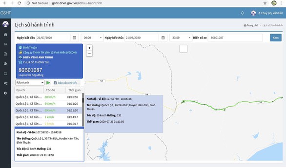 Theo Tổng cục Đường bộ Việt Nam, tốc độ được ghi nhận cuối cùng của ôtô khách 16 chỗ trên quốc lộ 1A qua xã Tân Đức (huyện Hàm Tân) lúc 1h11 phút 50 giây sáng 21/7 là 69 km/h, trước đó một phút, xe có tốc độ 80 km/h. Còn xe tải lúc 1h12 phút 29 giây chạy 23 km/h, trước đó 10 giây, tốc độ xe này là 60 km/h.