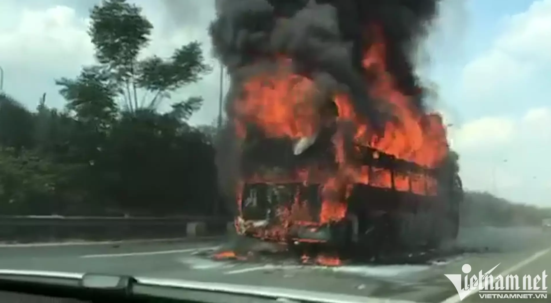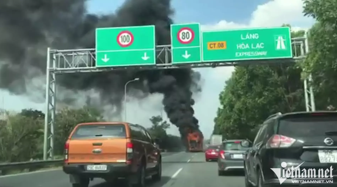 Nhiều lái xe lưu thông trên tuyến Đại lộ Thăng Long cho biết, khoảng 15h chiều 26/6, khi đang di chuyển đến khu vực chân cầu An Khánh (Km 69+500, xã An Khánh, huyện Hoài Đức, Hà Nội) họ phát hiện khói bốc ra từ phía sau ô tô khách giường nằm mang BKS 19B- 016.XX.