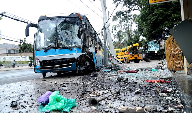 Khi đến địa điểm trên, chiếc xe khách bất ngờ lao qua phần đường bên trái, tông thẳng vào trụ điện trung thế, rồi lao vào một góc trụ sở một ngân hàng. Cú tông trực diện khiến cột điện trung thế gãy đổ nhiều khúc, pano ngân hàng bị hư hỏng.