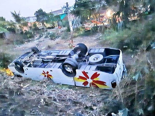 Tai nạn khiến xe khách lao xuống lề đường lật ngửa. 6 người trên xe khách và ông Tuấn bị thương, được người dân chuyển đi bệnh viện cấp cứu.