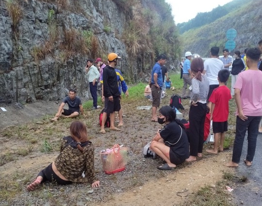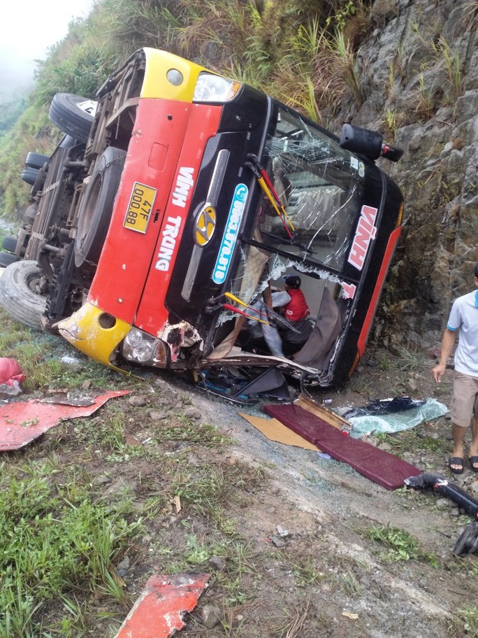 Sau khi xe lật vào vách núi thì nhiều người đã đập kính thoát ra ngoài, một số bị thương.