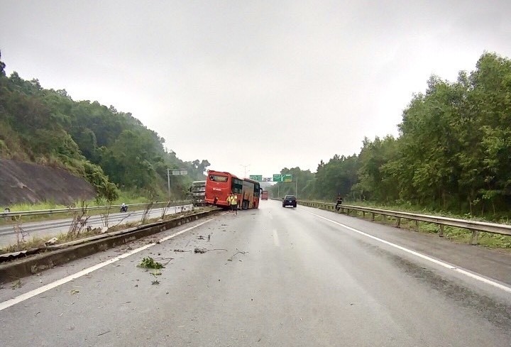 Hậu quả vụ tai nạn khiến phần đầu chiếc xe khách bị biến dạng, hư hỏng nghiêm trọng, gần 100m dải phân cách bị xô đổ. Rất may không có thiệt hại về người.