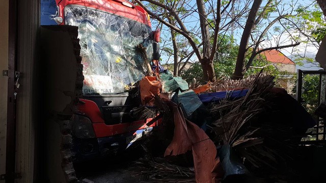 Tại hiện trường, phần đầu chiếc ô tô giường nằm bị hư hỏng, phần kính bị vỡ nát, tường phía trước của nhà dân bị đổ sập.