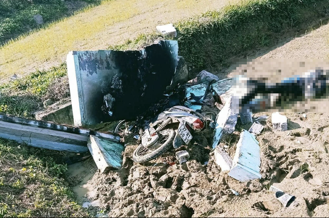 Khi đến khu vực cổng chào của làng, chiếc xe máy lao thẳng vào mảng tường bằng bê tông của cổng chào. Cú va đập mạnh khiến xe máy lao xuống ruộng, bị mảng tường bê tông vỡ đè lên.