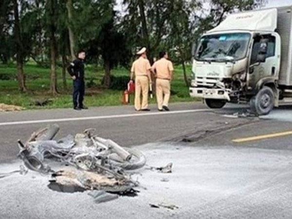 Tại hiện trường, xe máy biến dạng, còn ôtô tải bị cháy phần cabin.
