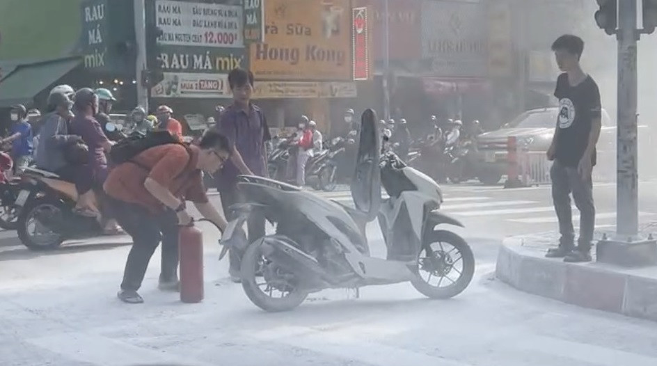 Đang chạy trên đường Lê Văn Sỹ, quận 3 (TP.HCM), nam thanh niên phát hiện xe máy bốc cháy vội dừng phương tiện, hô hoán mọi người ứng cứu.