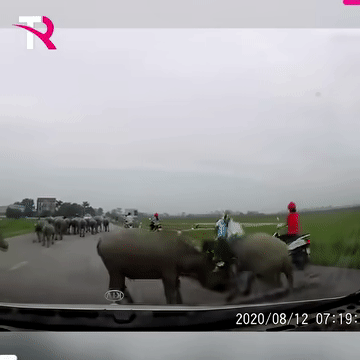 Cùng lúc, 1 đôi nam nữ đi trên chiếc xe máy chạy bon bon trên đường và giữ khoảng cách với đàn trâu. Tưởng rằng sẽ an toàn vượt qua được đàn trâu này thì đôi nam nữ bất ngờ bị 2 con trâu lao vào đấu đá nhau rồi húc trúng xe máy.