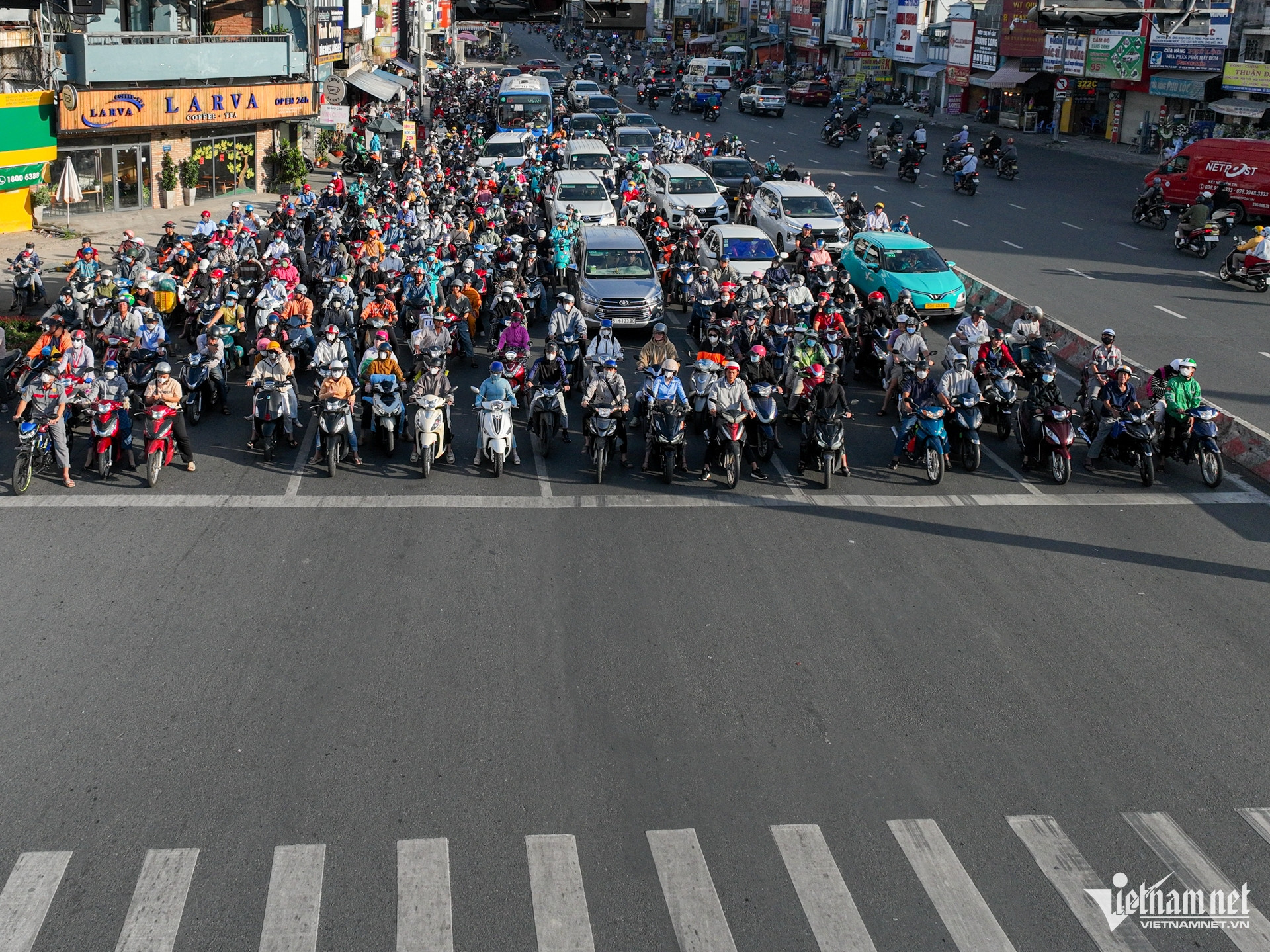 Giao lộ Nguyễn Văn Đồng - Nguyễn Xí ken đặc phương tiện đứng chờ tín hiệu đèn giao thông trong giờ tan tầm.