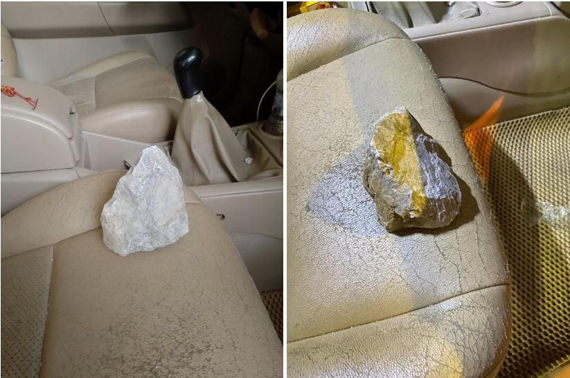 “Viên đá nặng gần 1kg xuyên qua kính lái, vỡ gương chiếu hậu và rơi vào ghế sau ô tô” – anh T.T.A nói.