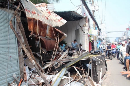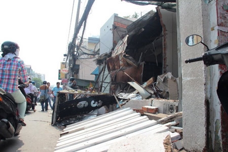 Chiếc xe rác được cho bị mất lái khi đang chạy đã bất ngờ tông sập ba căn nhà trên đường Cách Mạng Tháng Tám, Q.10, TP HCM.
