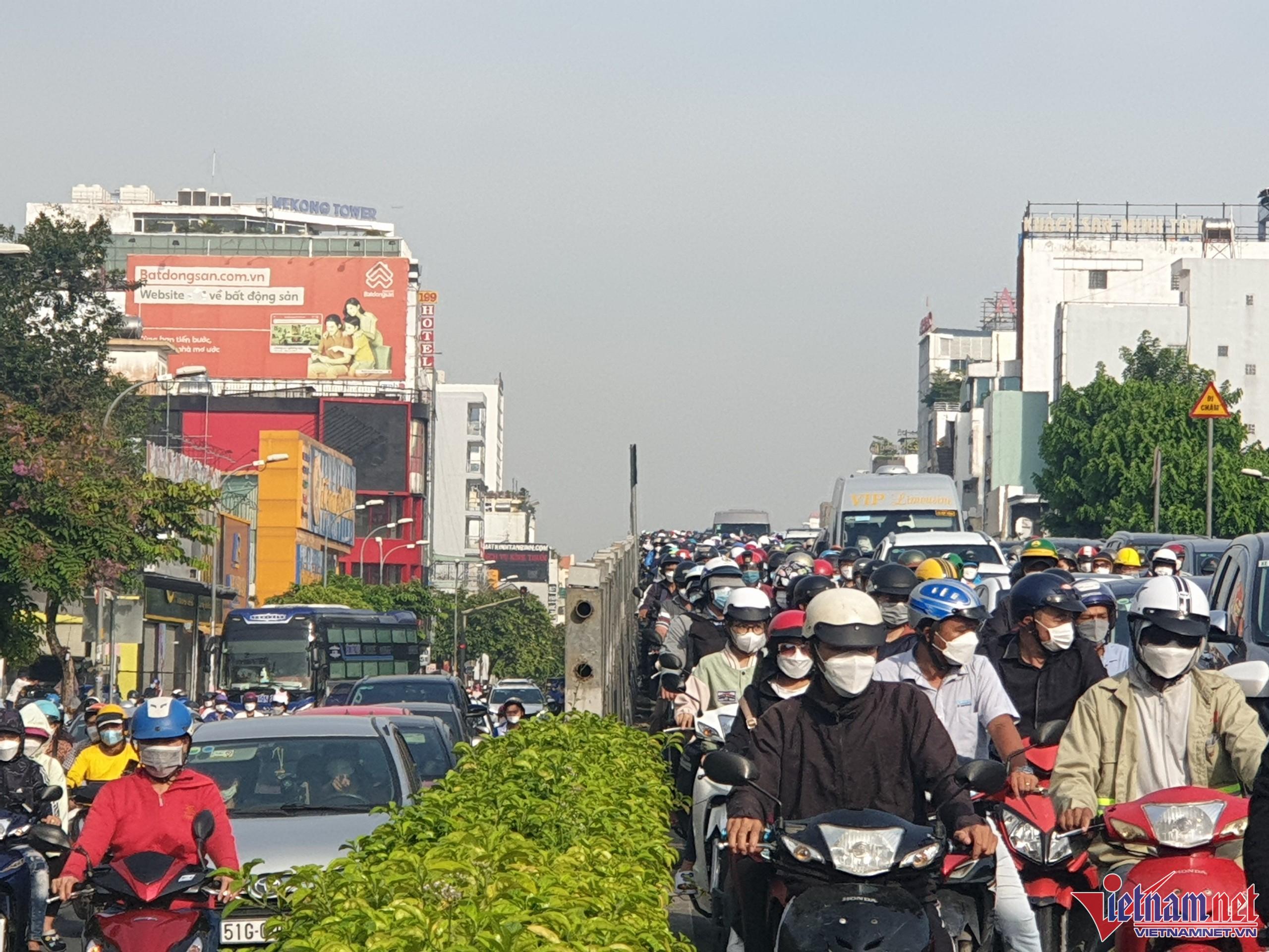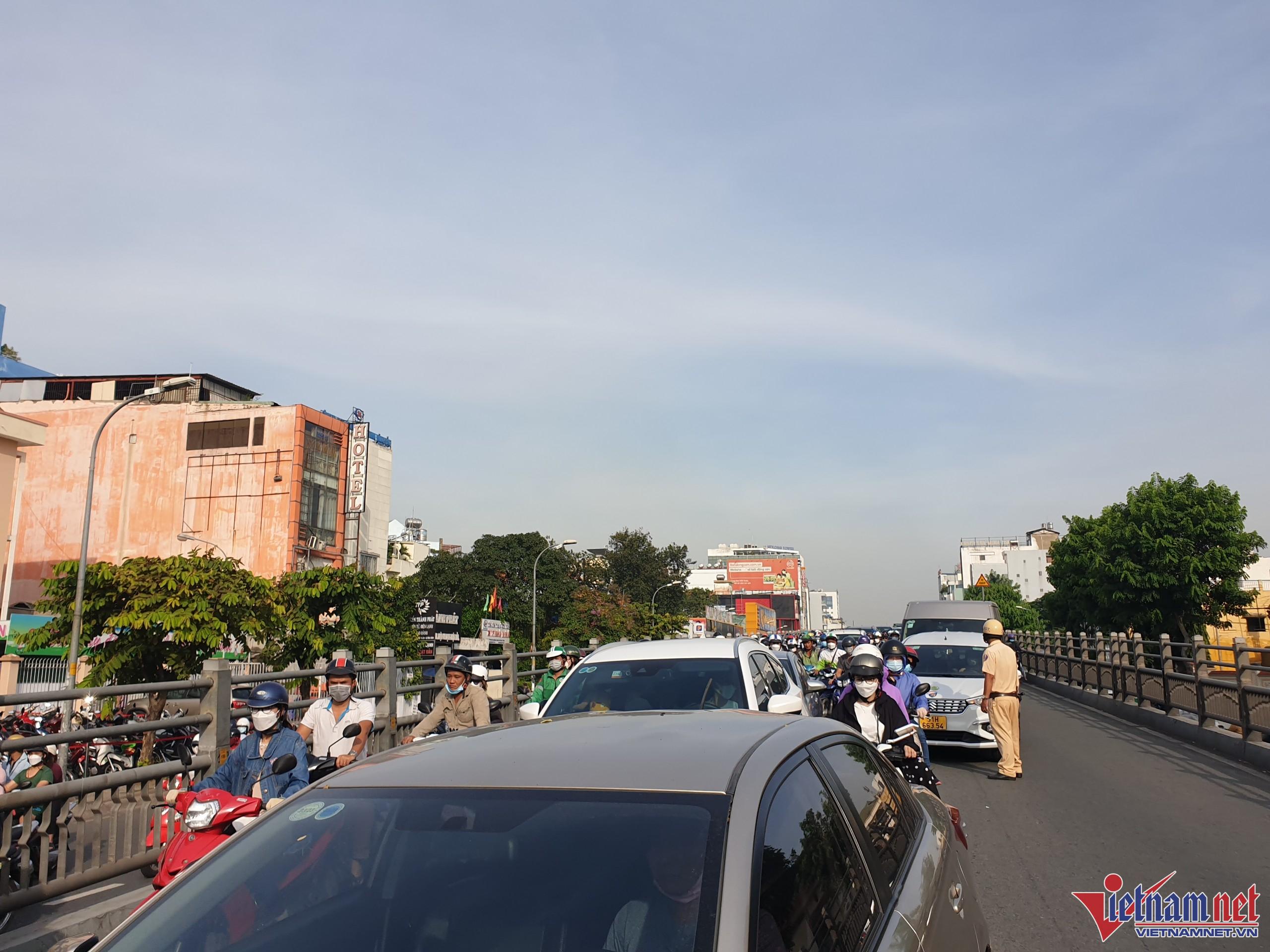 Do vụ tai nạn xảy ra vào giờ cao điểm, gây ảnh hưởng giao thông. Phương tiện di chuyển qua cầu Hoàng Hoa Thám bị dồn ứ, kẹt cứng.