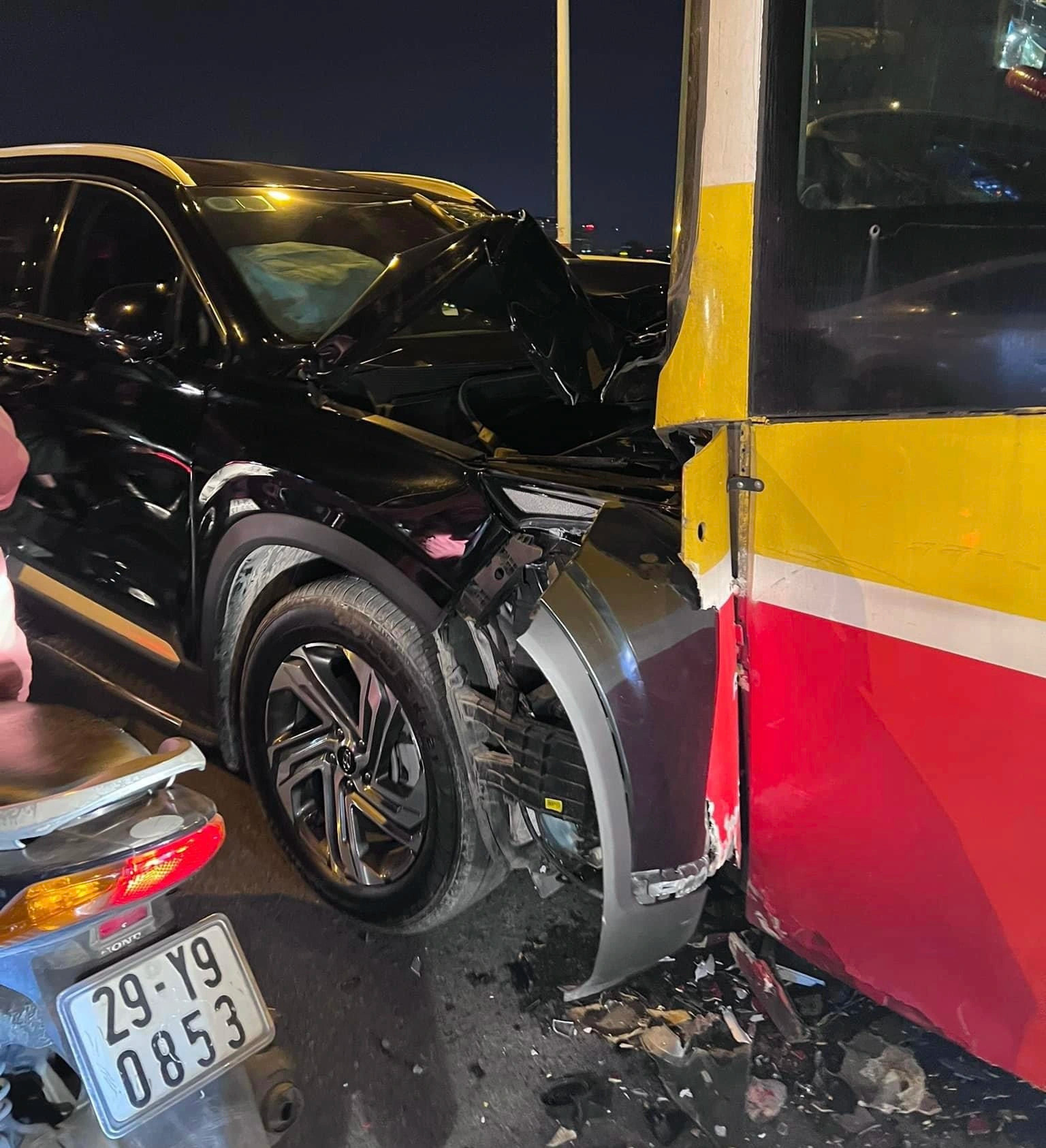 13/10/2022 15:36Xe SantaFe lấn làn đâm vỡ đầu xe buýt