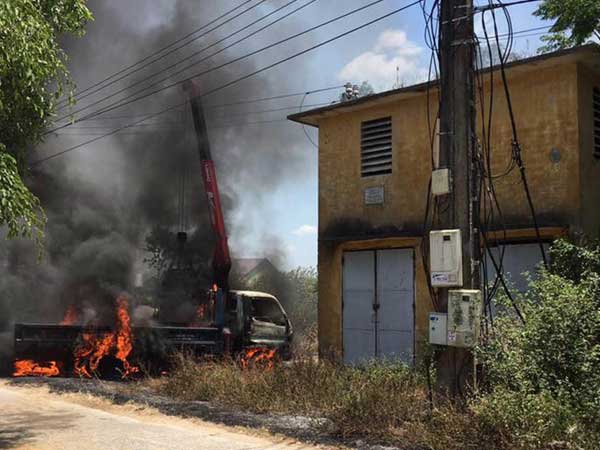 Thông tin ban đầu, vào thời điểm trên, chiếc xe tải cần cẩu mang BKS: 37C: 30787 lưu thông đến xóm Yên Thịnh để cẩu hàng. Trong lúc xe đang cẩu hàng thì bị vướng vào dây điện phía bên trên khiến chập điện gây ra hỏa hoạn.