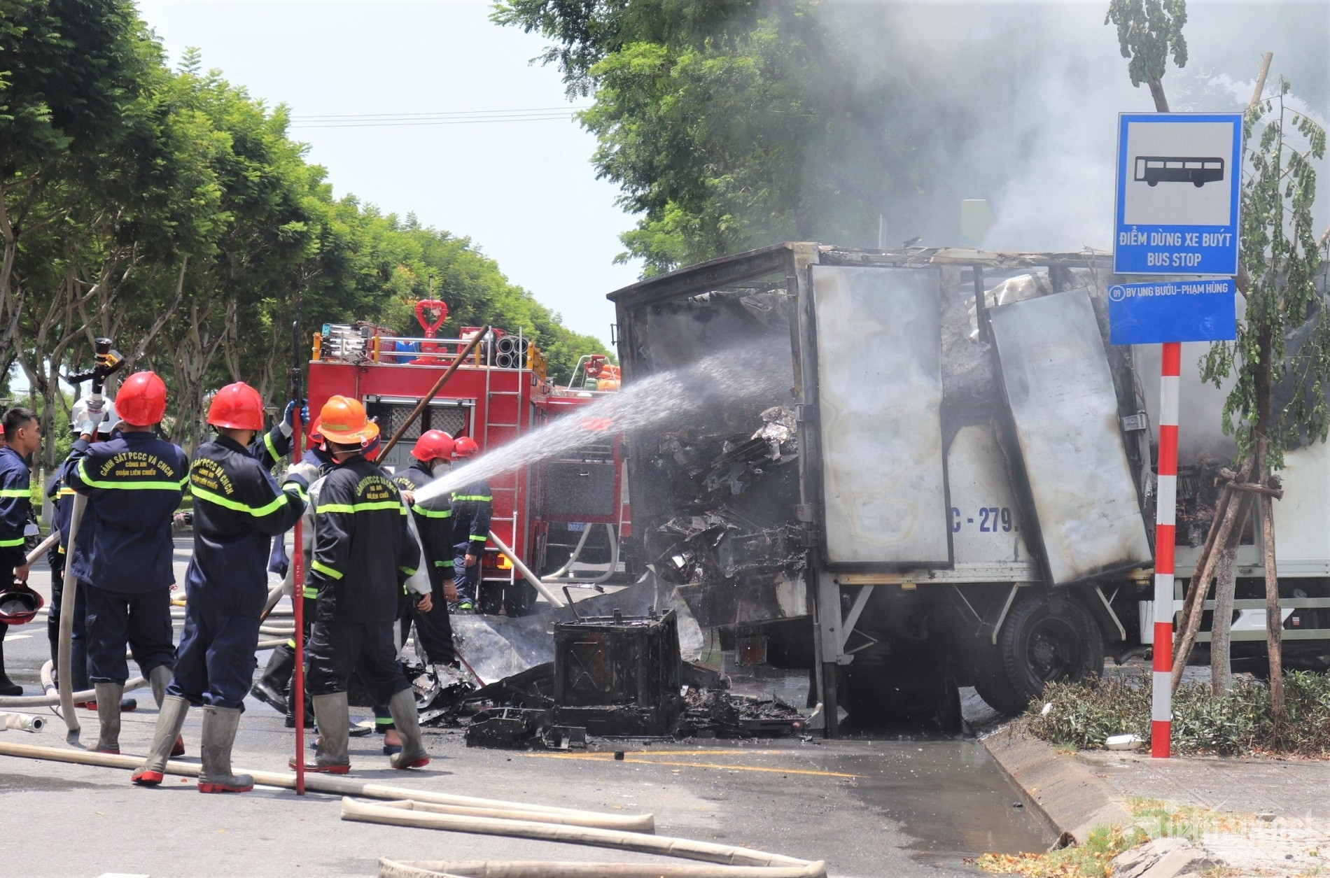 Gần 1 giờ sau, đám cháy được khống chế hoàn toàn. Tại hiện trường, xe tải bị thiêu rụi phần thân sau.
