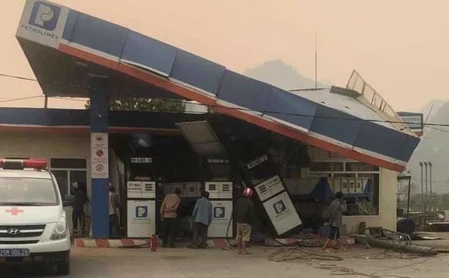 Tại hiện trường, mái, trụ bơm cây xăng đổ sập thiệt hại nặng.