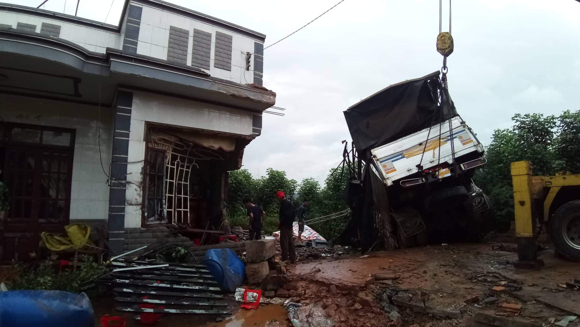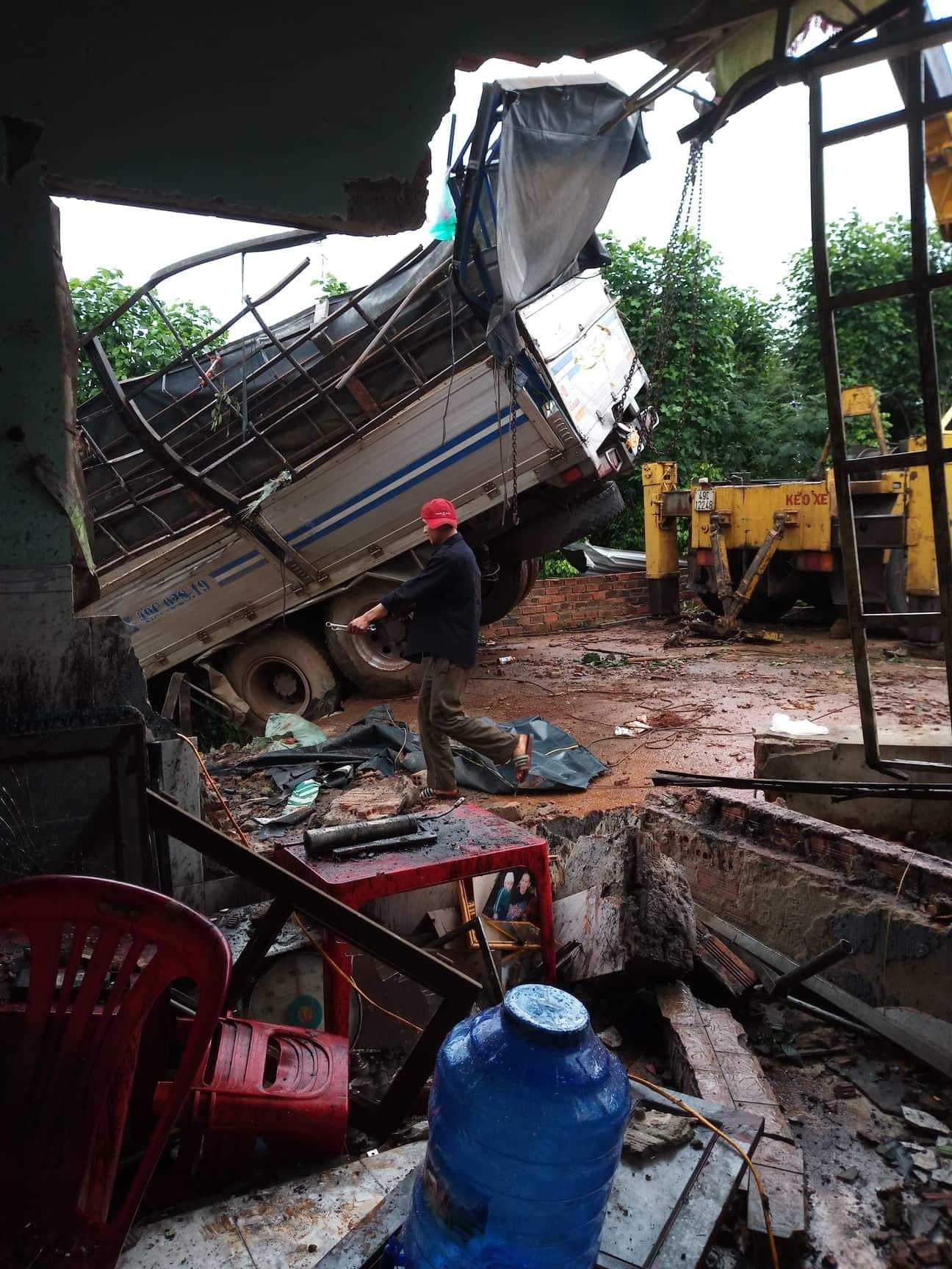 Trong khi đó, ngôi nhà ông Trường bị xe tải tông sập một phần phòng khách, nhiều vật dụng bên trong như bàn ghế, tủ… cũng bị hư hỏng.