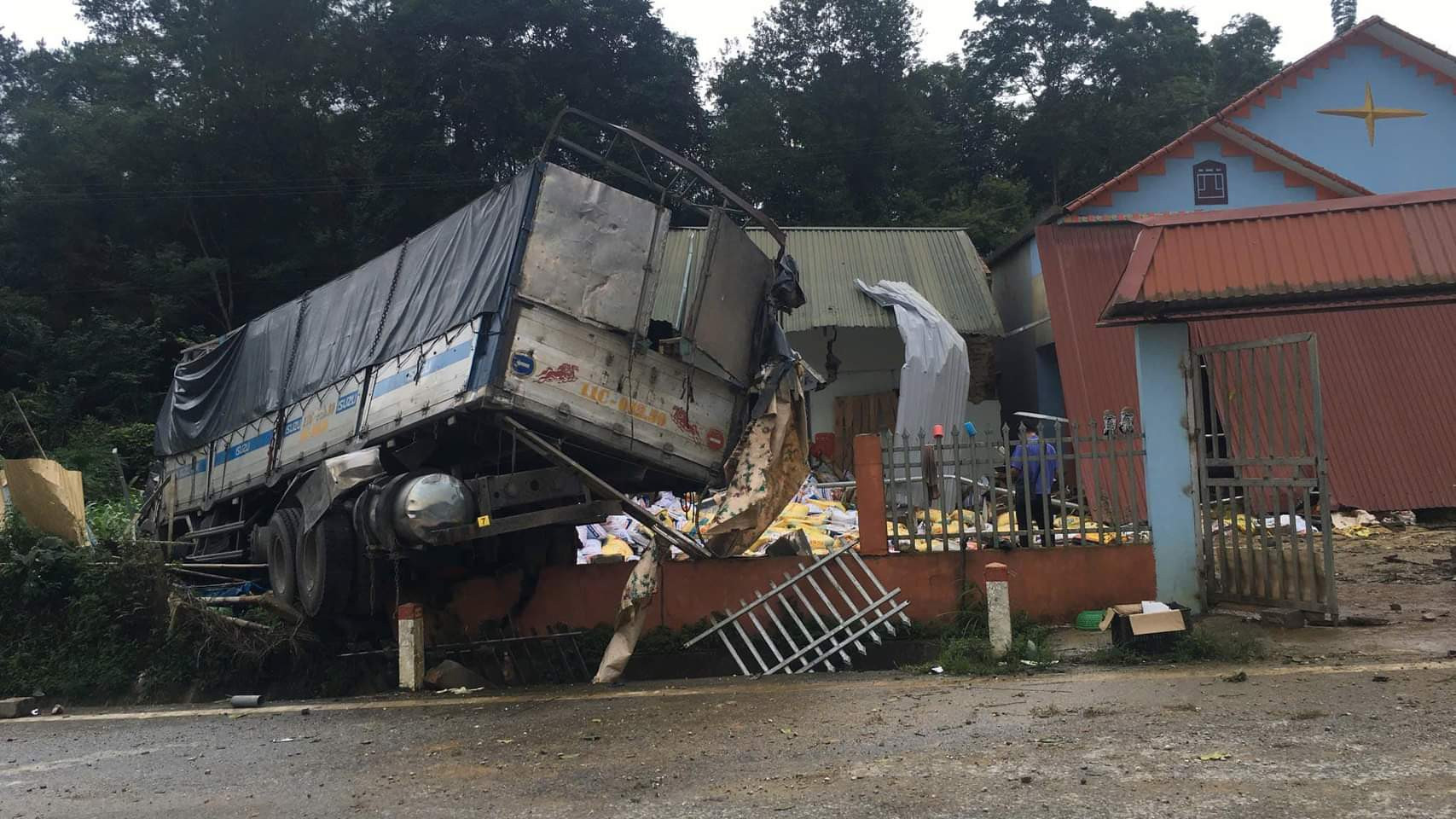 Khi đến km101+600, đường Hồ Chí Minh, đoạn qua tiểu khu Bản Súng, thị trấn Vân Tùng, xe tải đâm vào lề đường, tường rào, mái tôn và 3 ngôi nhà của người dân bên đường.