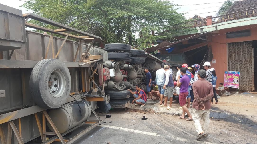 Chưa dừng lại, sau cú đâm mạnh, chiếc đầu kéo đẩy xe tải tới phía trước lao vào nhà ông Phạm Quang Tiến (SN 1970, trú xã Hoài Tân, huyện Hoài Nhơn) gây hư hỏng một phần. Tại hiện trường, chiếc đầu kéo bị lật nhào chắn ngang làn đường QL1, phần đầu xe này dính vào phía sau xe tải. Tài xế xe tải bị thương nhẹ, tài xế đầu kéo bị chấn thương cột sống.