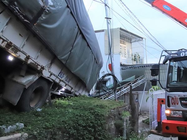 Sau khi đâm liên tiếp vào 2 xe tải đang đỗ trên đường, chiếc xe tải này tiếp tục đâm sập một phần mái nhà của gia đình bà Đặng Thị Vòng trên đường Trần Quốc Toản rồi mới dừng lại.
