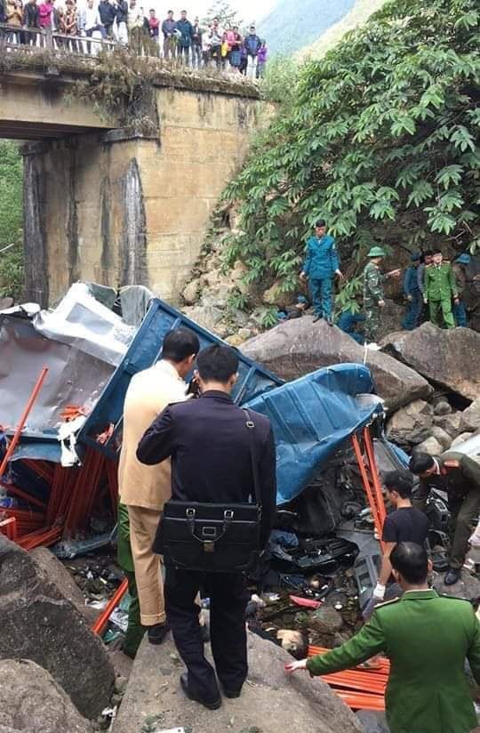 Tại hiện trường, chiếc xe hư hỏng toàn bộ, biến dạng, nằm dưới vực sâu khoảng 10 m so với mặt đường.