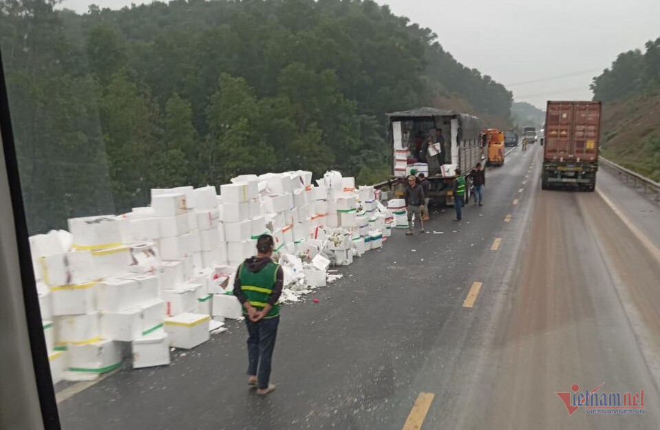 Khi đến Km04 cao tốc Cam Lộ - La Sơn (đoạn qua huyện Cam Lộ, tỉnh Quảng Trị), xe tải bất ngờ bị lật nghiêng, nằm chắn ngang đường khiến hàng chục thùng xốp đựng trái cây rơi vãi khắp nơi.