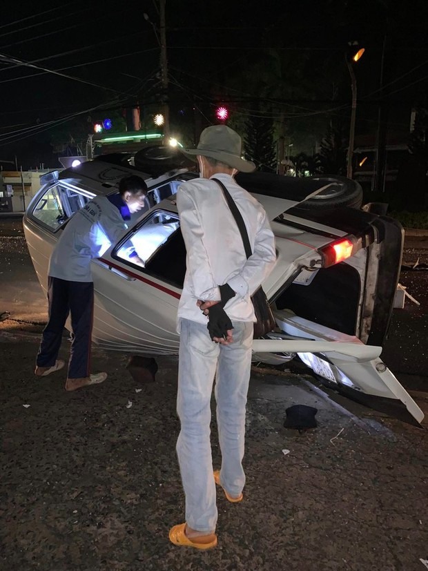 Cú va chạm mạnh khiến đầu xe tải biến dạng, xe 7 chỗ lật ngang trên đường. Tài xế xe tải bị thương.