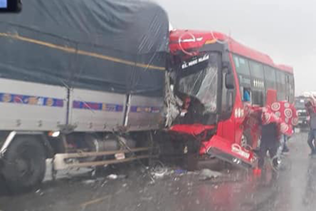 Tại hiện trường, đầu xe tải và xe khách bị hư hỏng nặng. Lúc xảy ra tai nạn, đoạn đường này đang có mưa lớn, mặt đường trơn.