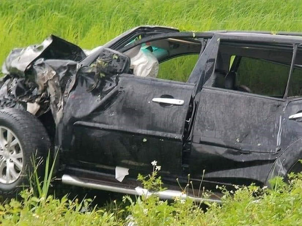 Cú va chạm mạnh khiến chiếc xe tải bị lật, ô tô con bị văng xuống vệ đường. Cả 2 xe bị biến dạng.
