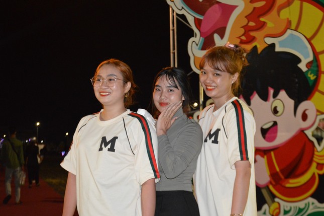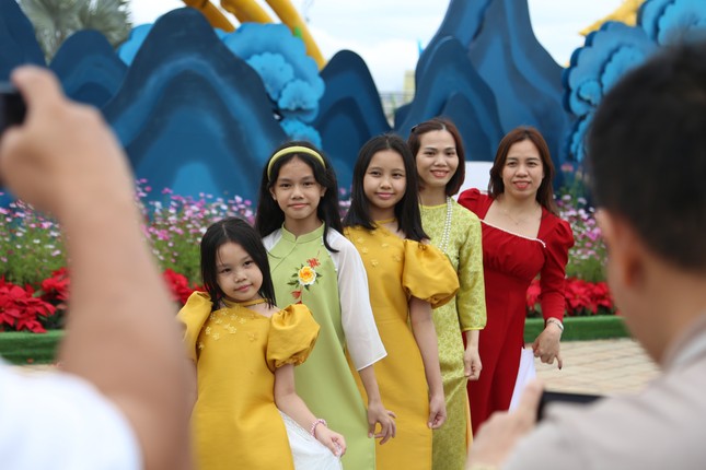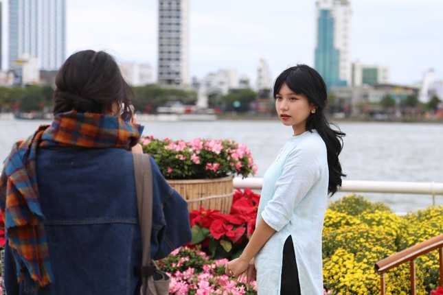 Chị Nguyễn Diệu Hiền (34 tuổi, quận Hải Châu) hẹn nhóm bạn cùng diện áo dài để lưu lại những khoảnh khắc đẹp bên các linh vật Tết Giáp Thìn . "Thời tiết ngày cuối năm rất thuận lợi để người dân du xuân đón Tết. Sau khi chuẩn bị xong mâm cúng giao thừa, tôi tranh thủ cùng bạn bè ra đường hoa, uống cà phê rồi chờ xem pháo hoa", chị Hiền nói.