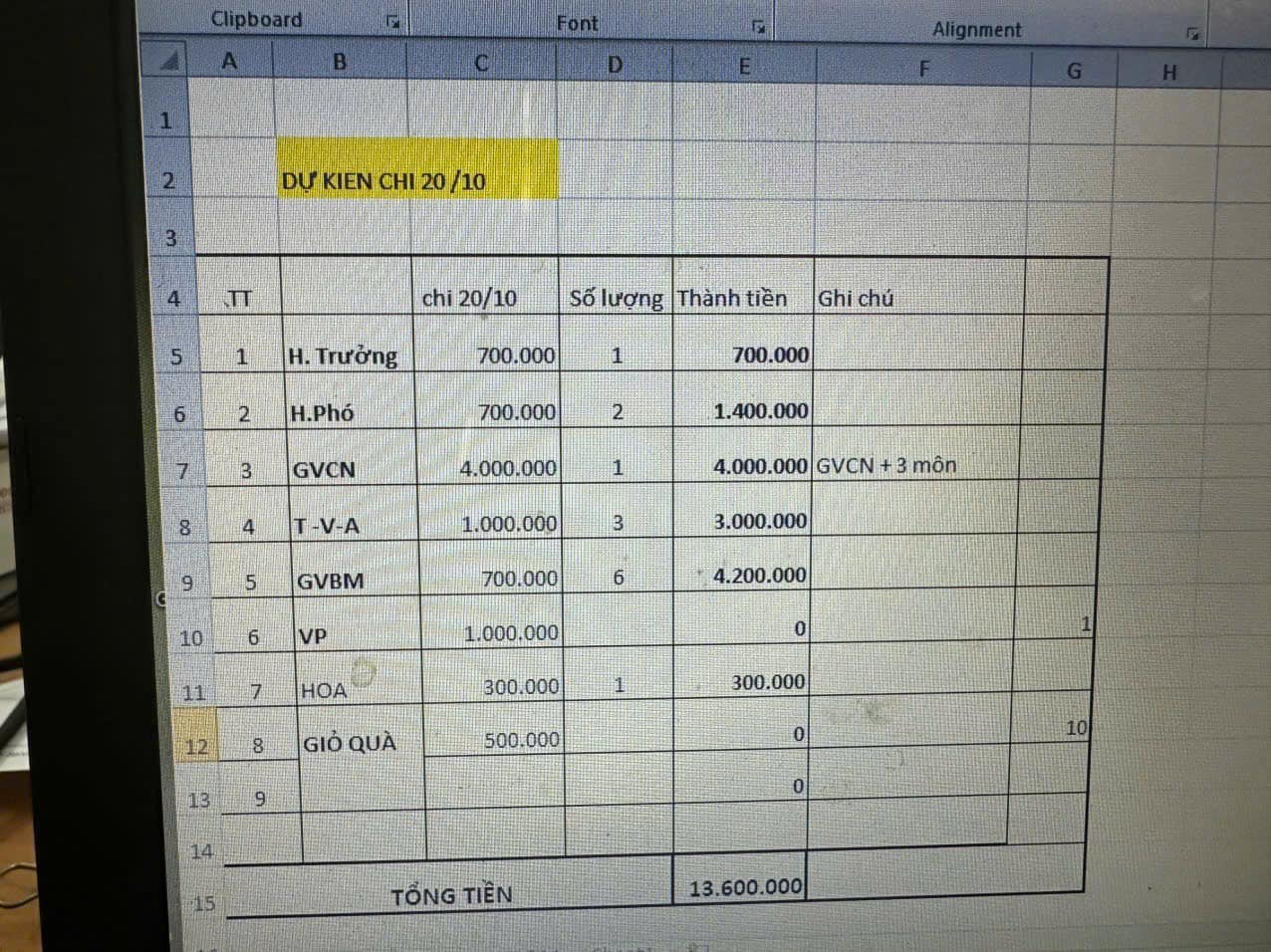Mới nhất, một phụ huynh lớp 10 đăng ảnh chụp bảng dự kiến chi 20/10 ở lớp con mình lên mạng xã hội cùng một số dòng chia sẻ thể hiện thái độ bất mãn. Chỉ trong vài phút, bài đăng đã nhận được rất nhiều lượt tương tác và bình luận. Theo thống kê ở trong bảng, tổng số tiền dự kiến chi 20/10 lên tới 13,6 triệu đồng, với nhiều khoản dự chi quà cho hiệu trưởng, hiệu phó, giáo viên chủ nhiệm, giáo viên bộ môn,...