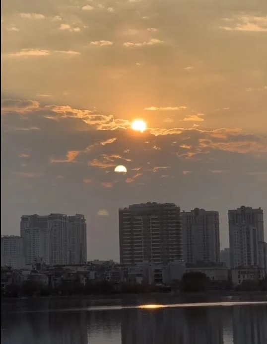 Trước đó, vào ngày 11/3, mạng xã hội cũng xôn xao hiện tượng 2 mặt trời cùng lúc xuất hiện ở hồ Tây (Hà Nội). Hình ảnh ghi lại cho thấy, một mặt trời lớn to tròn và sáng hơn nằm phía trên cùng, ở dưới xuất hiện một mặt trời nhỏ hơn, ẩn dưới những đám mây.