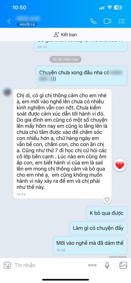 Tuy nhiên, phụ huynh của cháu bé khẳng định không thể chấp nhận lời xin lỗi, cho rằng không có lý do nào đủ để bao biện cho hành vi bạo hành trẻ nhỏ. Người mẹ cũng chia sẻ thêm, dù con chưa biết nói nhưng mỗi lần đến lớp đều sợ hãi, không dám bước vào – dấu hiệu rõ ràng cho thấy bé đã bị ảnh hưởng tâm lý.