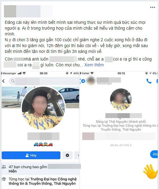 Theo chia sẻ của nam thanh niên T.C này thì người yêu đã đi chơi buổi tối và gọi đến cả 100 cuộc điện thoại nhưng lại chỉ dám nghe 2 cuộc, còn liên tục giấu giếm không nói là đi chơi ở đâu và chơi với ai. Thậm chí phải đến khi thanh niên này đến tận nơi tìm thì 3h sáng bạn gái mới trở về nhà.