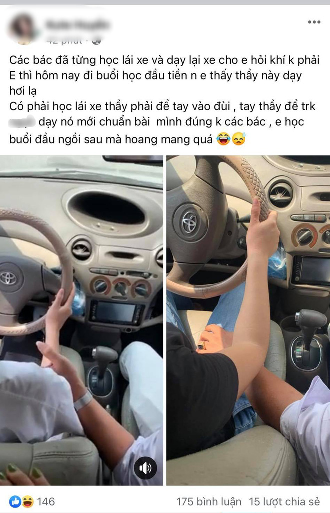 Theo chia sẻ của tài khoản K.H, ngay trong buổi đầu đi học lái xe chị đã chứng kiến những hành động đụng chạm của thầy giáo kèm theo băn khoăn "có phải thầy giáo để tay vào đùi, để tay trước ngực dạy mới chuẩn bài phải không".
