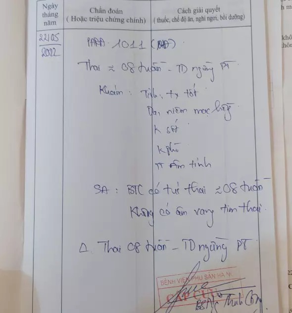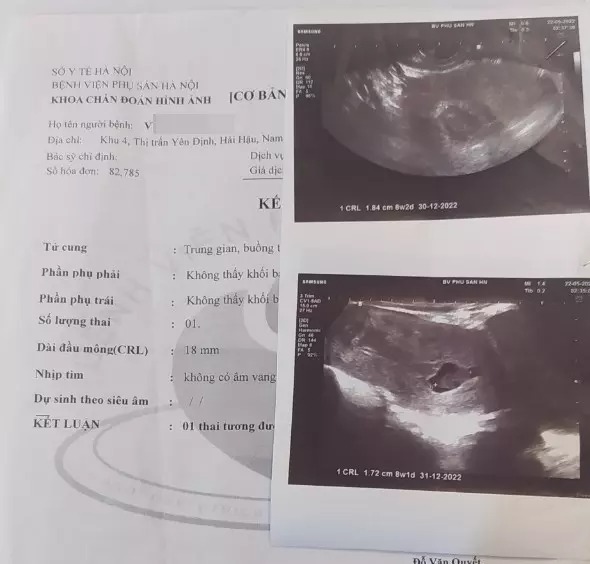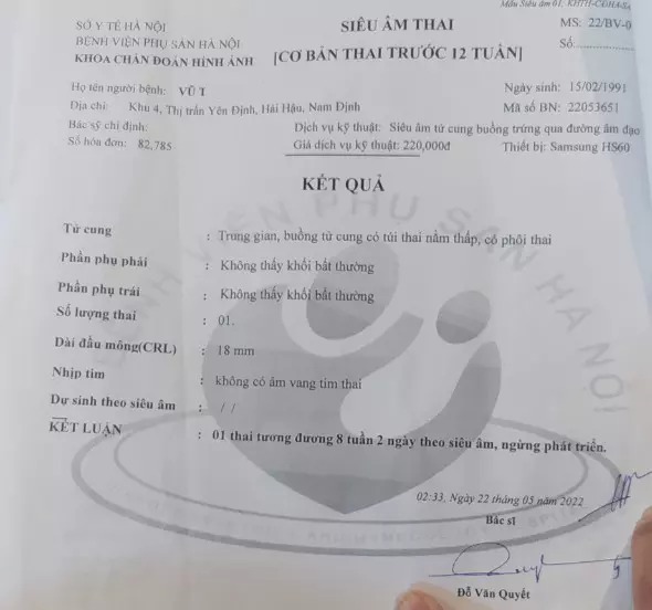 Ghi nhận của Trí Thức Trẻ, theo kết quả siêu âm, bác sĩ kết luận chị Tr "1 thai tương đương 8 tuần 2 ngày, ngừng phát triển".