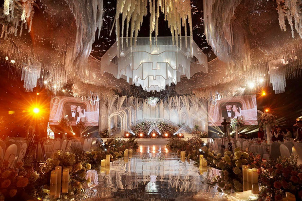 Đám cưới được tổ chức vô cùng hoành tráng với rạp cưới trang hoàng lộng lẫy. Sân khấu được thiết kế với nhiều hoa tươi, lộng lẫy, xa hoa.
