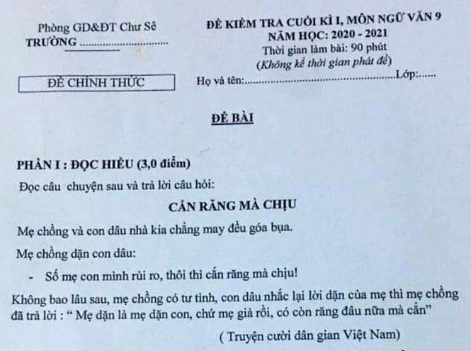 Ngoài đề thi được đánh giá hay, có yếu tố mới, lạ thì một số đề thi Ngữ văn khác đã gây xôn xao dư luận. Mới đây, phần đọc hiểu trong đề kiểm tra môn Ngữ văn lớp 9 cuối học kỳ I của Phòng GD-ĐT huyện Chư Sê, Gia Lai đã trích 1 câu chuyện được cho là không trong sáng và có phần dung tục.