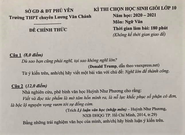 Trước đó, hồi đầu năm học, đề thi chọn học sinh giỏi lớp 10 của Trường THPT Chuyên Lương Văn Chánh (Phú Yên) đã trích dẫn câu nói của ông Donald Trump: “Dù sao bạn cũng phải nghĩ, tại sao không nghĩ lớn?"- và yêu cầu học sinh viết một bài văn với chủ đề: "Nghĩ lớn để thành công" khiến học sinh thích thú.
