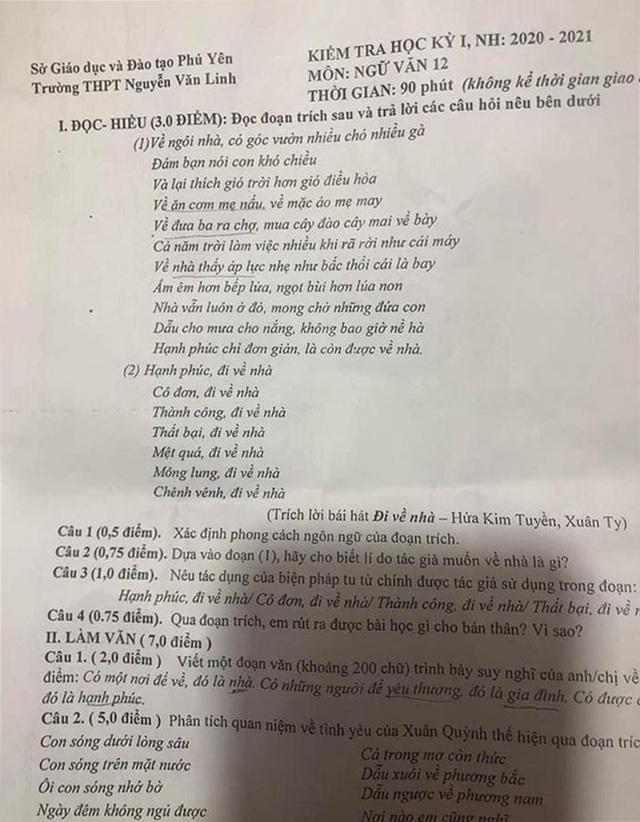 Mới đây, đề thi Ngữ văn cuối học kỳ I dành cho học sinh lớp 12 của Trường THPT Nguyễn Văn Linh (Hưng Yên) đã trích lời bài hát trong ca khúc "Đi về nhà" của ca sĩ Đen Vâu.