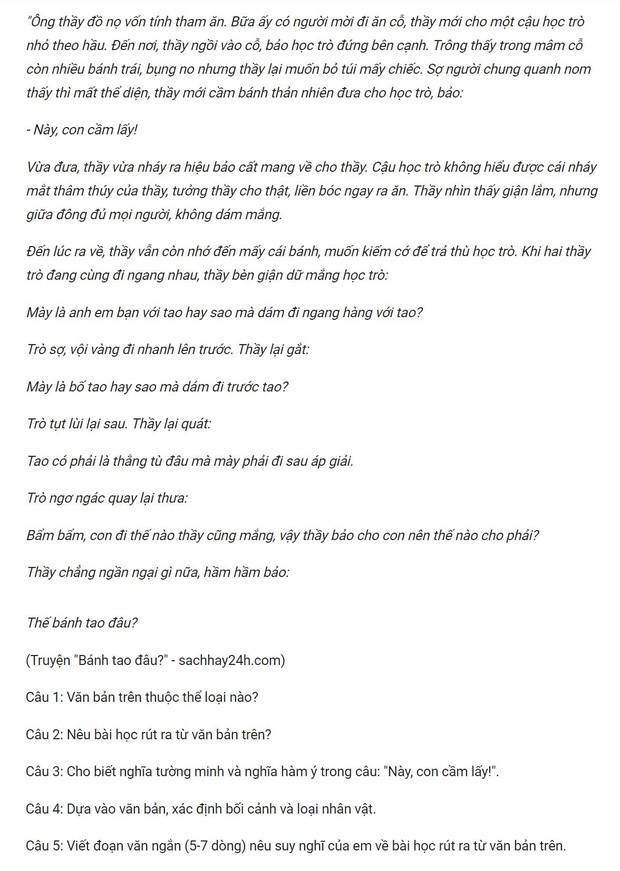 Con tôi bảo đó giờ cứ nghĩ thầy đồ là người cao cả, đáng kính và mực thước. Giờ mới biết thầy đồ vừa xấu tính lại vừa tham ăn, còn xưng mày - tao với trò nữa... Ngữ liệu của đề thi phải mang tính giáo dục học sinh chứ sao lại thế này?" - chị T. bức xúc đặt câu hỏi.