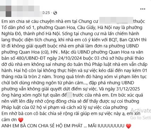 Theo đó, 1 tài khoản tên A.P đã chia sẻ câu chuyện của gia đình anh xảy ra tại 1 khu chung cư thuộc phường Quan Hoa (cũ), Cầu giấy, Hà Nội nay là phường Nghĩa Đô, Hà Nội. Theo tài khoản này chia sẻ, mâu thuẫn xảy ra giữa 3 hộ gia đình liên quan đến việc lấn chiếm hành lang chung cư thuộc diện tích chung, gia đình đình này đã làm đơn gửi phường Quan Hoa (cũ) và đã được giải quyết bằng cách buộc 3 chủ sở hữu tháo dỡ, tuy nhiên chỉ có 1 hộ thực hiện và 2 hộ còn lại không tuân thủ.