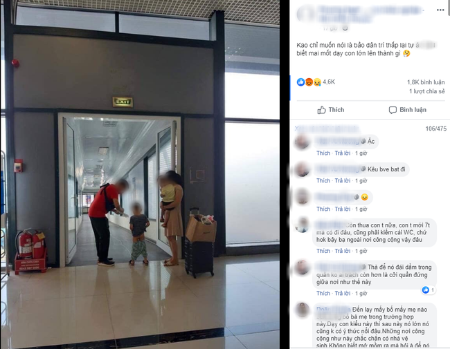 Trong hình ảnh được chụp lại cho thấy, cặp vợ chồng trẻ gồm 2 đứa con trai, trong khi người mẹ đang bế đứa con thứ 2 thì đứa con trai lớn khoảng chừng 4-5 tuổi đứng giữa lối đi dẫn ra sân bay và tiểu tại chỗ ra sàn. Việc làm này có sự chứng kiến và "giúp đỡ" của cả bố và mẹ.
