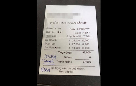 Câu chuyện trên được một cô gái có nickname V.N.M chia sẻ trên Facebook kèm theo một bức ảnh chụp phiếu thanh toán tại bàn 28 của quán cà phê này vào lúc 12 giờ 41 phút ngày 31.3.