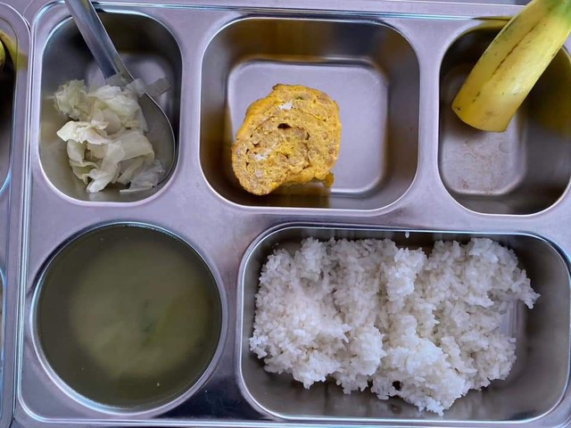 Thông tin trên được một phụ huynh có con đang theo học tại trường tiểu học tư thục này đăng tải. Theo các hình ảnh được chia sẻ, suất ăn tại ngôi trường tiểu học tư thục chỉ có cơm trắng, miếng trứng chiên nhỏ, rau cải luộc, canh loãng và nửa quả chuối.
