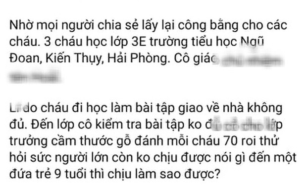 Chia sẻ với Thanh Niên, chị Đ. (người đã chia sẻ thông tin lên mạng xã hội facebook) cho biết: "Em trai tôi và 3 bạn cùng lớp bị đánh tím hết mông nhiều ngày nay. Khi về nhà, các em không dám nói với ai, không dám tắm. Đến khi gia đình phát hiện ra thì mới nói là bị cô giáo chủ nhiệm Vũ Thị H. (24 tuổi) và các bạn cán sự lớp dùng thước gỗ đánh mỗi người 70 cái vì không làm bài tập về nhà".
