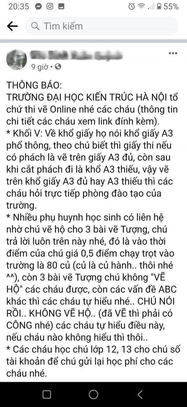 Tuy không nói rõ mục đích của việc rao bán tranh này là gì song tài khoản này liên tục đăng tải thông tin về kỳ thi, quy cách làm bài thi năng khiếu của trường ĐH Kiến trúc Hà Nội, dù nhấn mạnh không nhận vẽ hộ, song người này có phát ngôn: "còn các vấn đề ABC khác thì các cháu tự hiểu nhé.. CHÚ NÓI RỒI... KHÔNG VẼ HỘ... (đã VẼ thì phải có CÔNG nhé) các cháu tự hiểu điều này, nếu cháu nào không hiểu thì thôi..."
