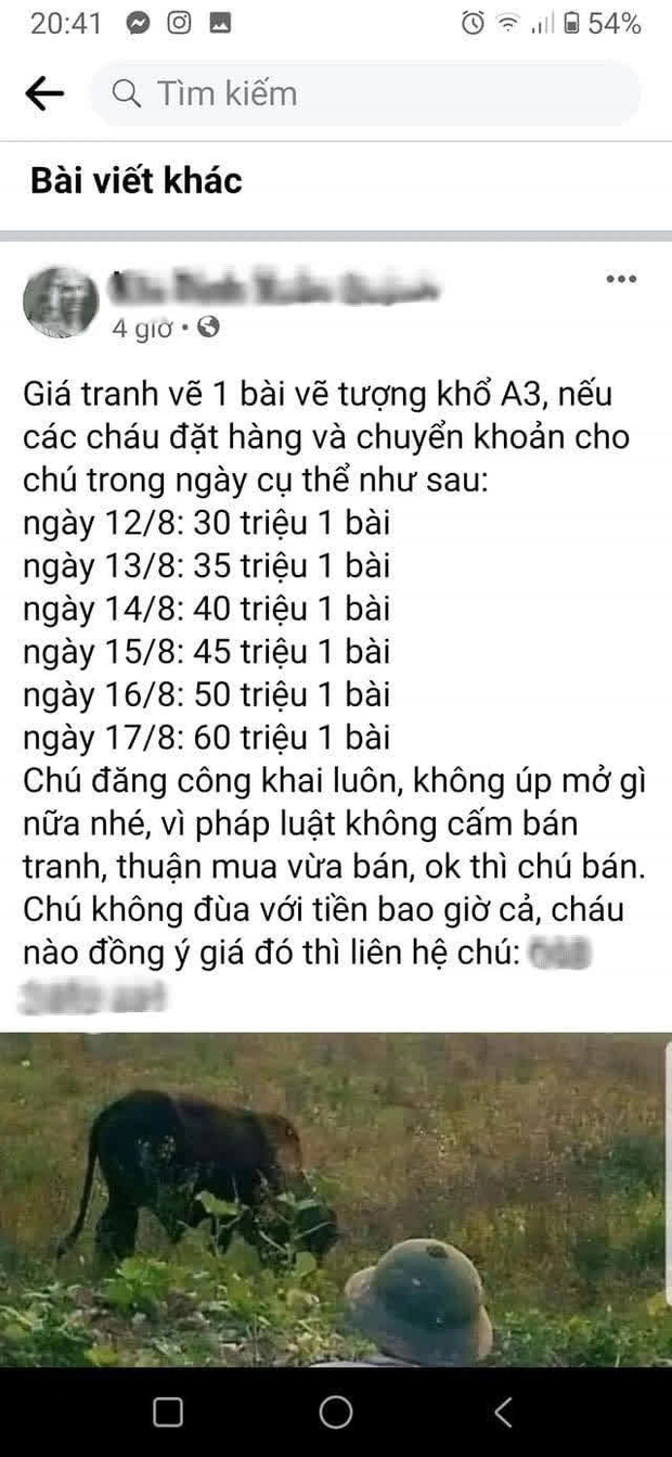 Chưa hết, mới đây nhất, người này còn niêm yết cả giá tranh mình bán lên MXH. Nhân vật này mở bán tranh trong 6 ngày, bắt đầu từ ngày trường ĐH Kiến trúc Hà Nội thông báo phương án thi năng khiếu và lại kết thúc ngay hôm kỳ thi diễn ra. Khởi đầu trong ngày 12/8, mức giá là 30 triệu, các hôm sau cho đến tận ngày thi, mỗi ngày tăng giá bài lên 5 triệu đồng và dừng lại ở con số 60 triệu. Giá này áp dụng cho cả bài vẽ khối V và H, theo lời người này nói.