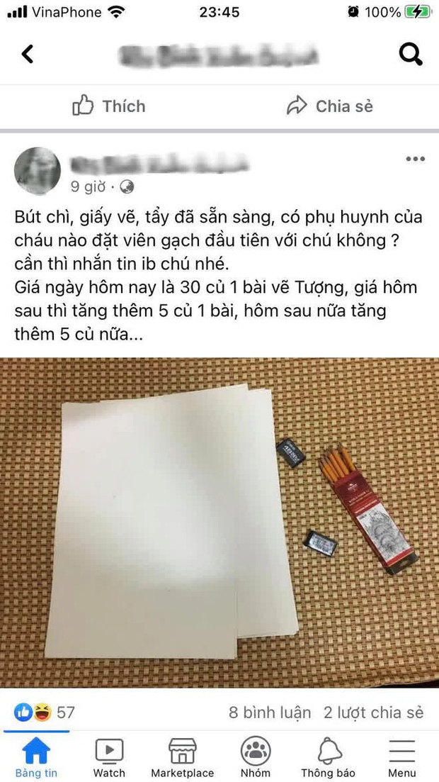 Ngay khi thông tin này vừa được nhà trường công bố, trên MXH nhanh chóng xuất hiện một tài khoản lấy danh là Kiến trúc sư tên Đ.X.Q ngỏ ý muốn bán tranh của mình và mời chào đối tượng khách hàng là phụ huynh, học sinh đến mua.