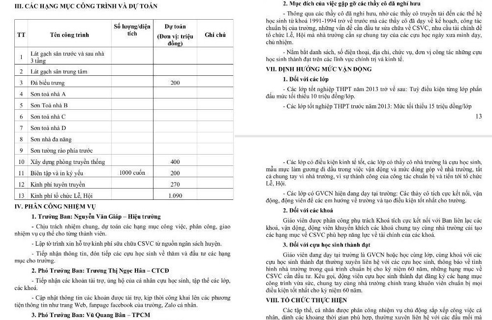 Theo bảng kê các hạng mục công trình dự kiến thực hiện có tất cả 13 hạng mục, gồm: Lát gạch sân trước và sau nhà 3 tầng; lát gạch sân trung tâm; đá biểu trưng; sơn tòa nhà A; nhà B; nhà C; nhà D; sơn nhà đa năng, sơn tường rào; xây dựng phòng truyền thống; biên tập và in kỷ yếu; kinh phí tuyên truyền; kinh phí tổ chức Lễ, Hội.